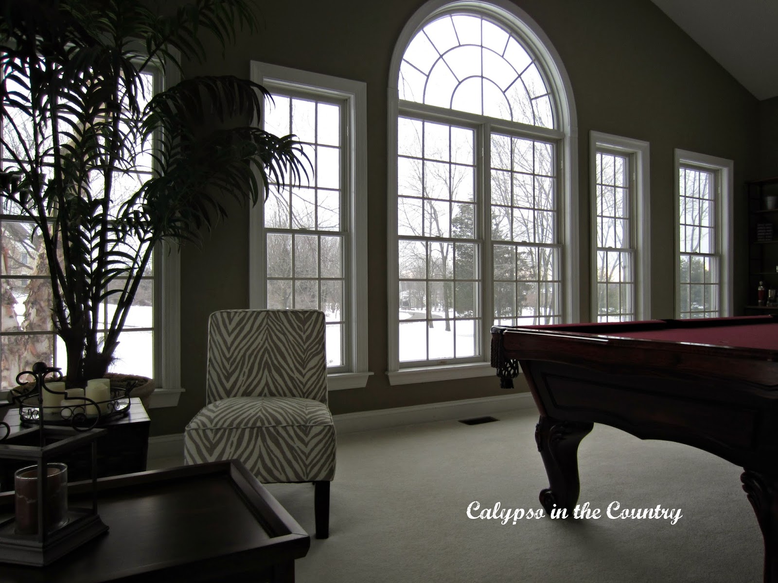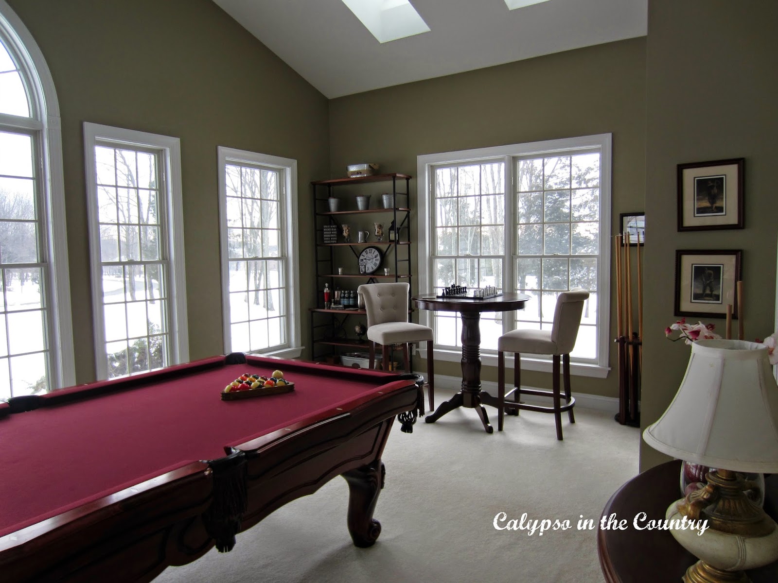 That's a lovely spot, Shelley! The snow scene out the window is beautiful, but I am truly glad it's your scene and not mine…..lol! I'm not a pool table person, but this is a much better set-up than many I've seen. It shatters my sense of "hominess" when I see a pool table plopped down in the middle of what should be a dining room with nothing added (no other furniture or decor) to make it appear to be part of the home — they look more like alien ships dropped down in the middle of the night. I think you've done a great job of making your room seem friendly and inviting.