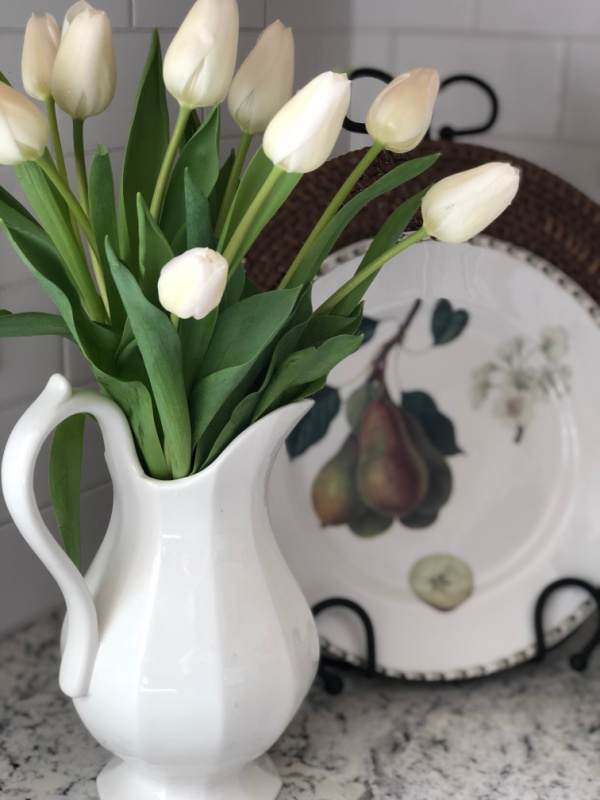Each season, I love changing the vignette in my kitchen corner. Simply by changing the dish to something springy and adding some flowers and greenery gives the spot a fresh new look. I frequently mix live flowers with faux greenery. Like I said, I don’t have a green thumb so I don’t need the pressure of keeping too many things alive at once!