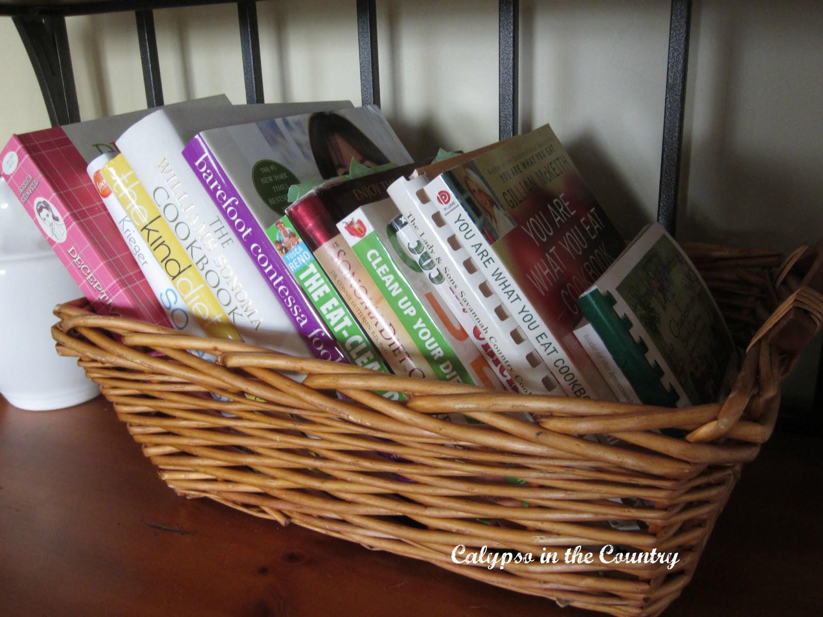 I love the look of cookbooks in a basket. I was thrilled when we received a gift basket over Christmas but not for the cheeses and other treats in there…but because I knew the basket would be the perfect size for cookbooks!