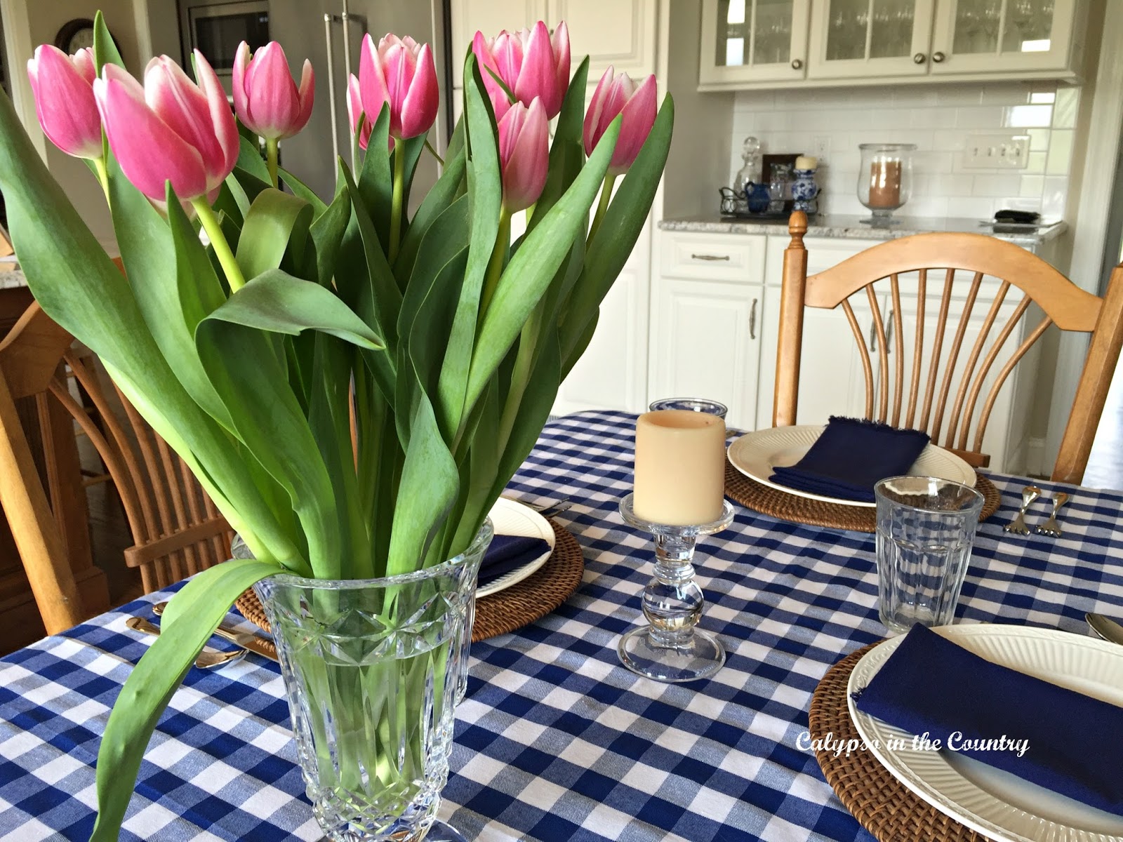 This year, I set the kitchen table in casual blue and white for Mother’s Day. Adding the pink tulips gave a pop of color.