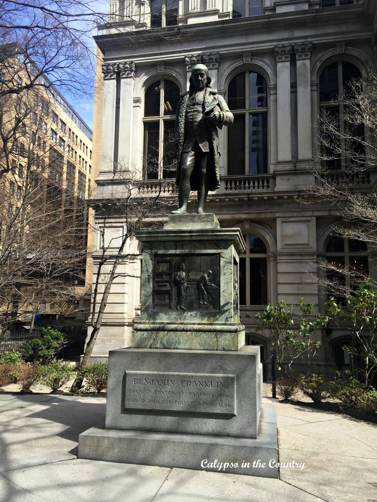 The Benjamin Franklin statue overlooks the site of the first public school in America.