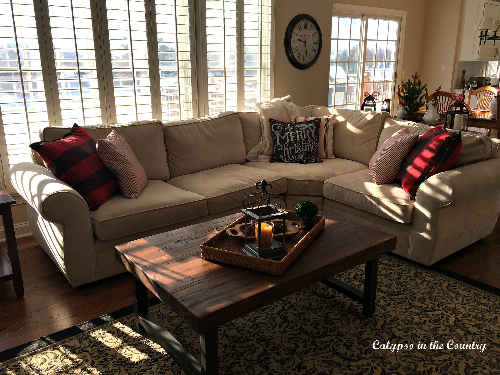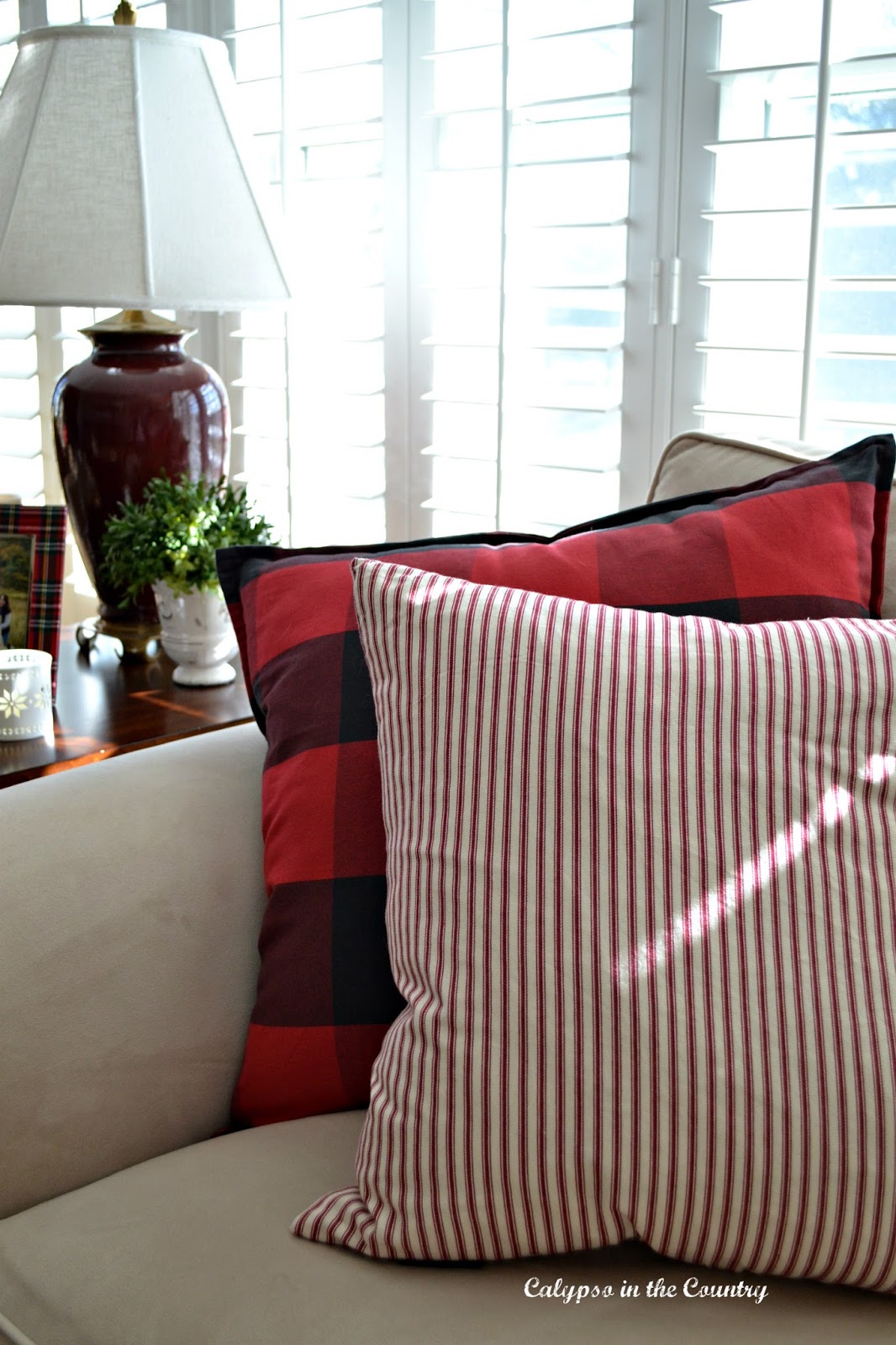 Red and black pillows dress up the cream colored sectional for the holidays.