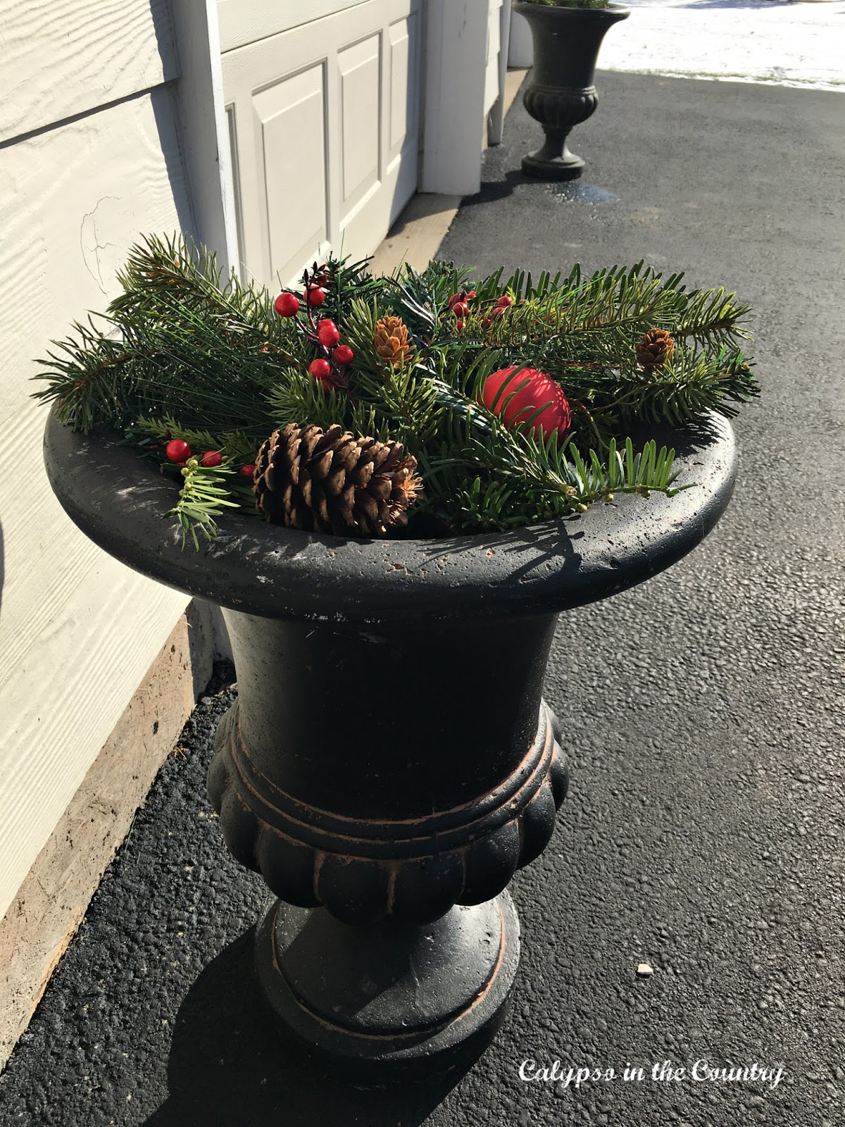 Since I didn’t have any plants in these urns, I just threw in some fresh greens and decorations.
