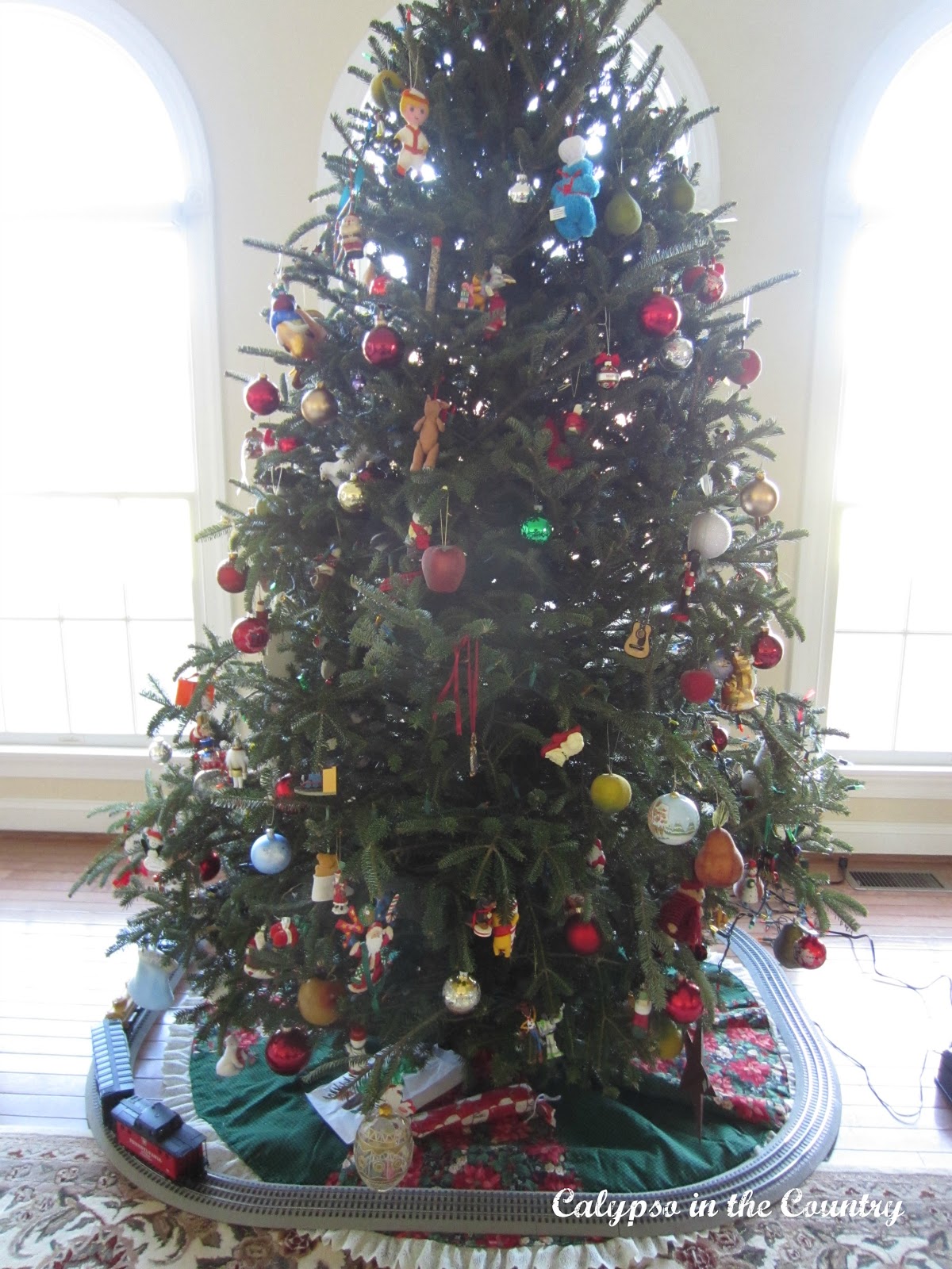 We often put a train around our tree, too. And ditto on the living room for the main tree — keeps the dog away!