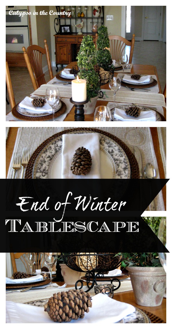It will be quite awhile before we can say bye to winter in our neck of the woods but I sure enjoyed seeing yours farewell! Love the green of the topiaries with the browns on your table! Your dishes are really pretty too.DD