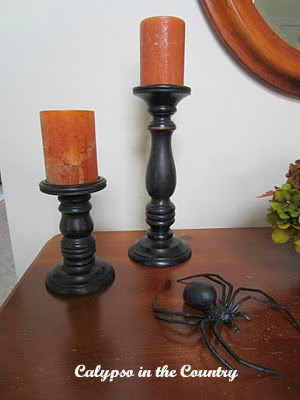 Black candlesticks with orange candles will take us right into Halloween. The candlesticks are from Pier One and I have several sets around the house. As one of my decorating staples, they go so well with everything!