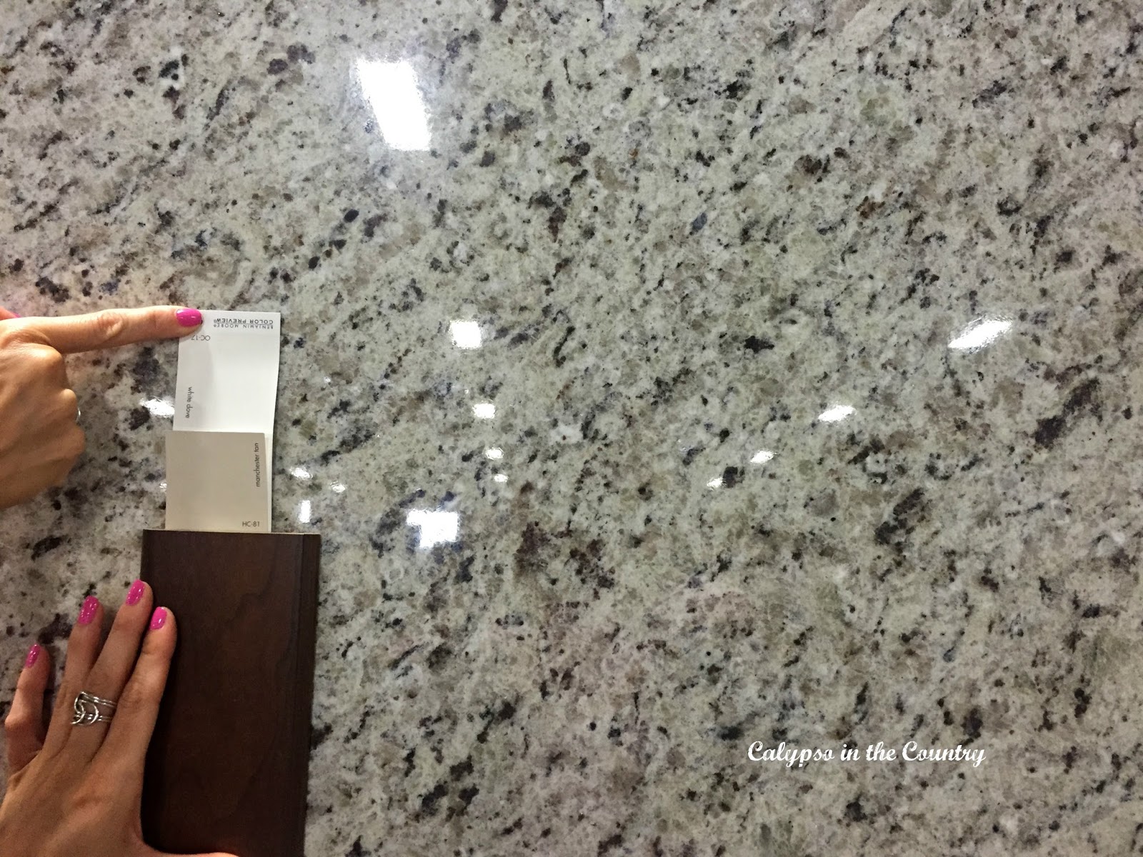 In some of my Houzz and Pinterest inspiration photos, I came across a granite called, White Springs. It blended beautifully with the White Dove painted cabinets as well as wood floors. Our granite supplier had a few slabs and I loved the colors in them – white background with a taupe/tan, black, and brown.