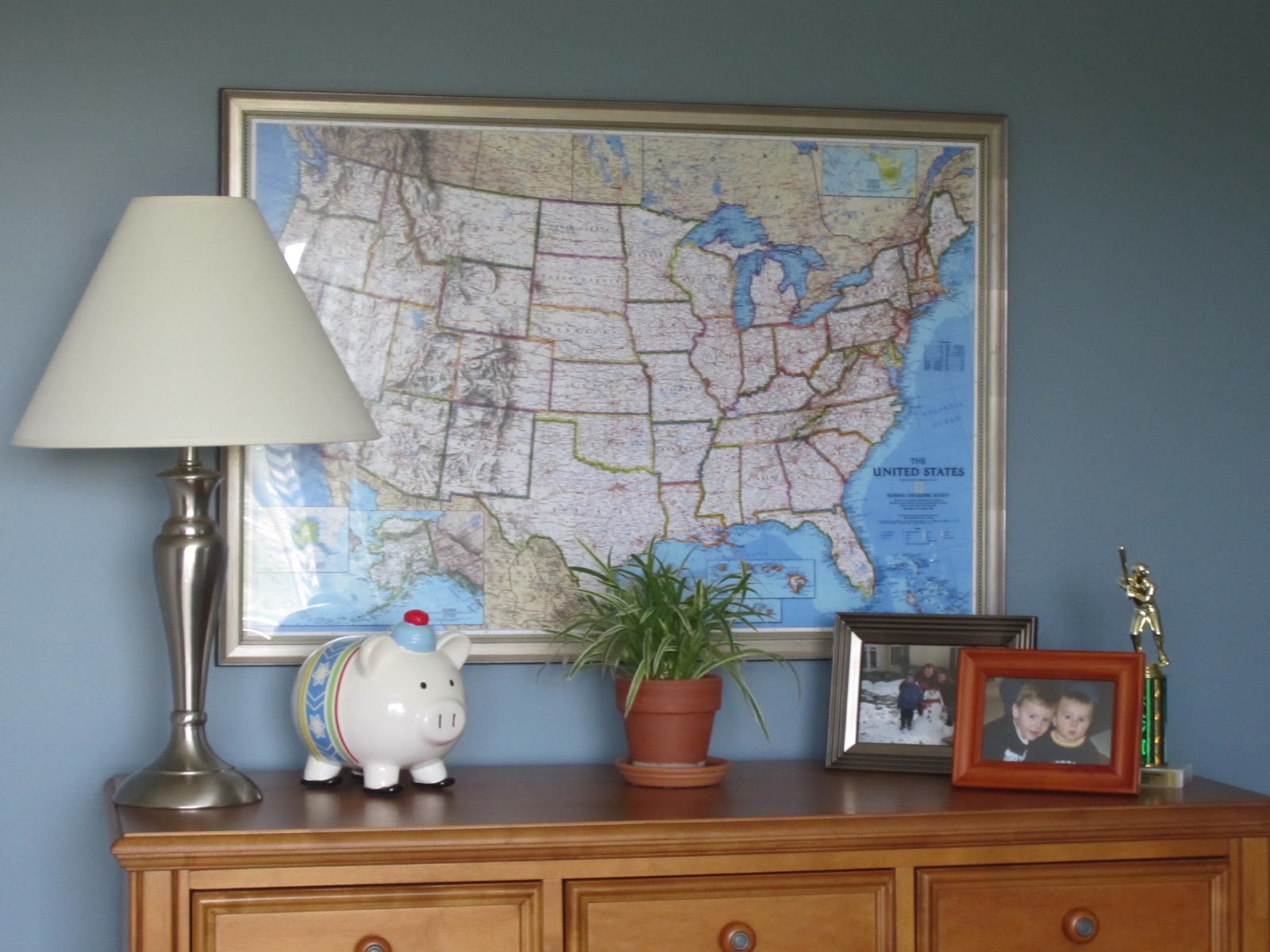 It's great that he can see it from his bed. I bet he will be able to commit all the states' locations to memory in no time…..something I still struggle with as an adult! The room looks great!