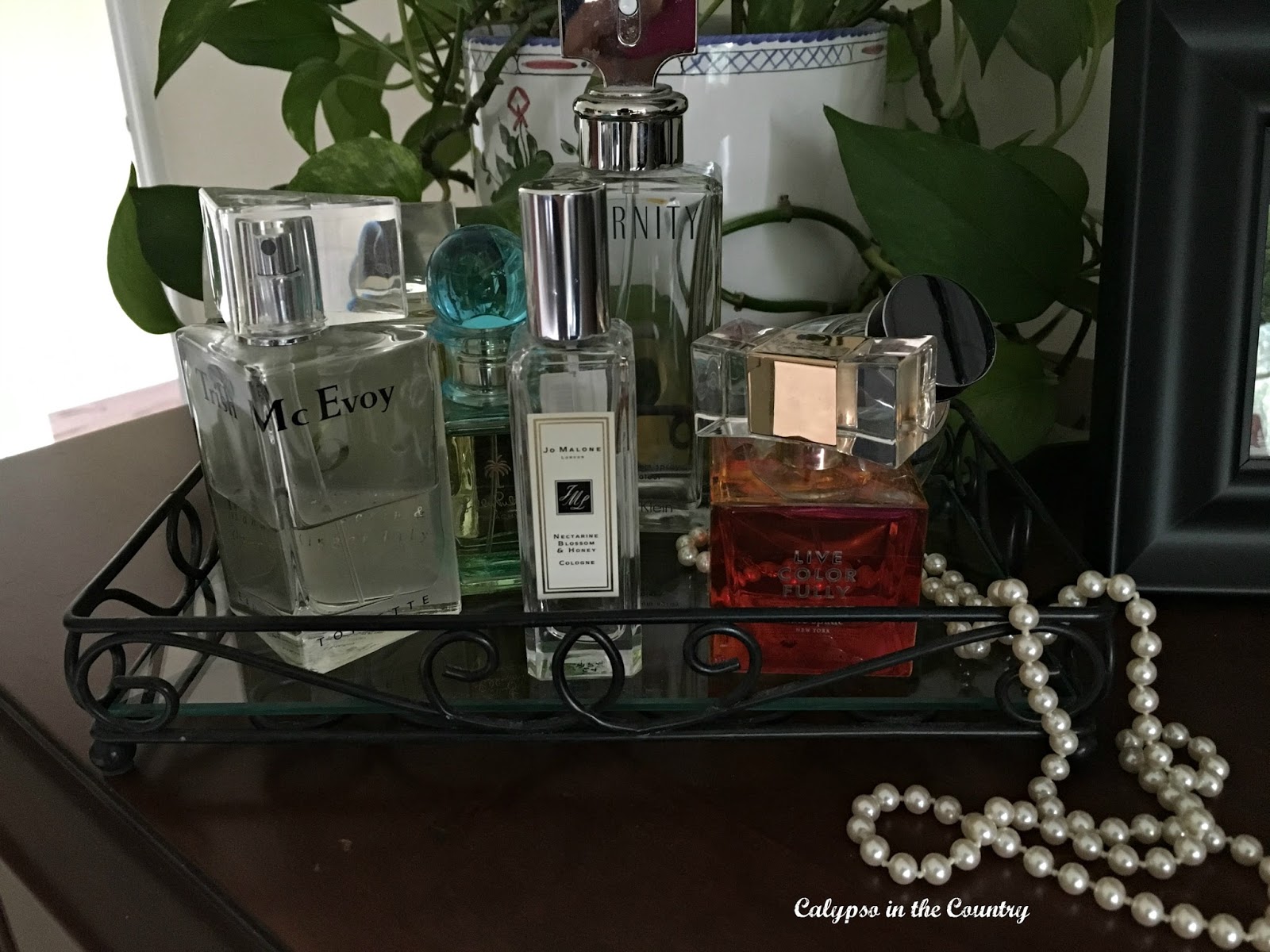 - Since my perfumes normally stay hidden under my sink in the bathroom, I displayed them all together on an old neglected tray. I bought the tray from Southern Living at Home years ago.