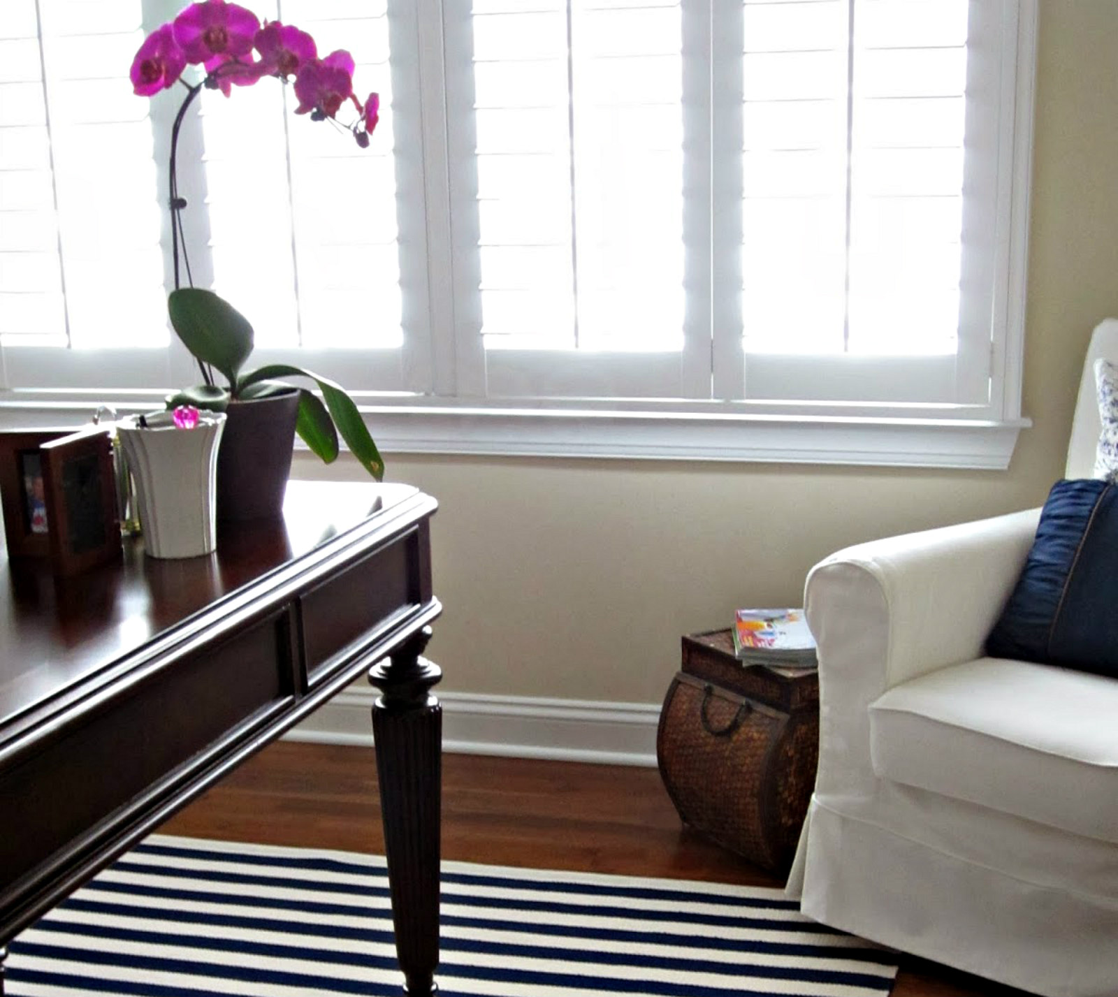 Most likely the shutters will stay in this position but I will have to live with them for awhile to be sure. Although it’s a living room, I still want that laid back, slightly tropical vibe. I can’t wait for the sun to start shining so I can take some really good pictures. (Will the sun EVER shine again? I am starting to wonder!)