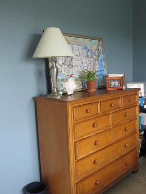I like the proportions of your map over the dresser, but I'd hang it where your son will look at it most and dream of traveling to far off places. (I see he already has a globe on his desk, too.) We always had U.S. and World maps hanging in our playroom. They make great art and do really interest kids in geography. They're so fun to look at, and you just can't help but study them. Your map is beautiful and looks terrific!
