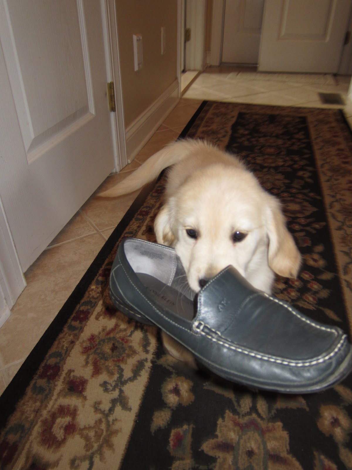 I bet you'll like her better when she's all grown up! lol! We used to give our dogs these chewable things called "bully sticks". They weren't cheap, but the dog was so busy chewing on it that our shoes were safe!