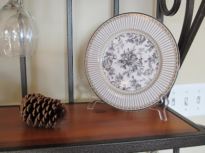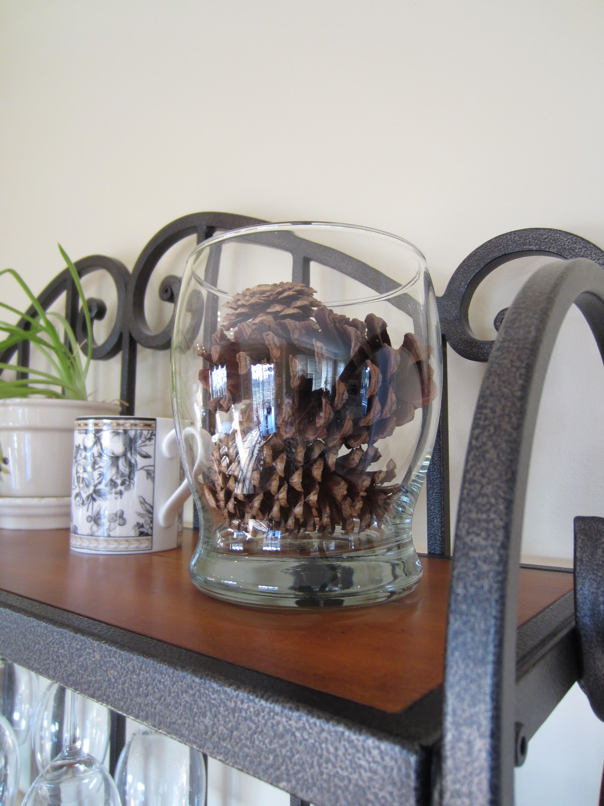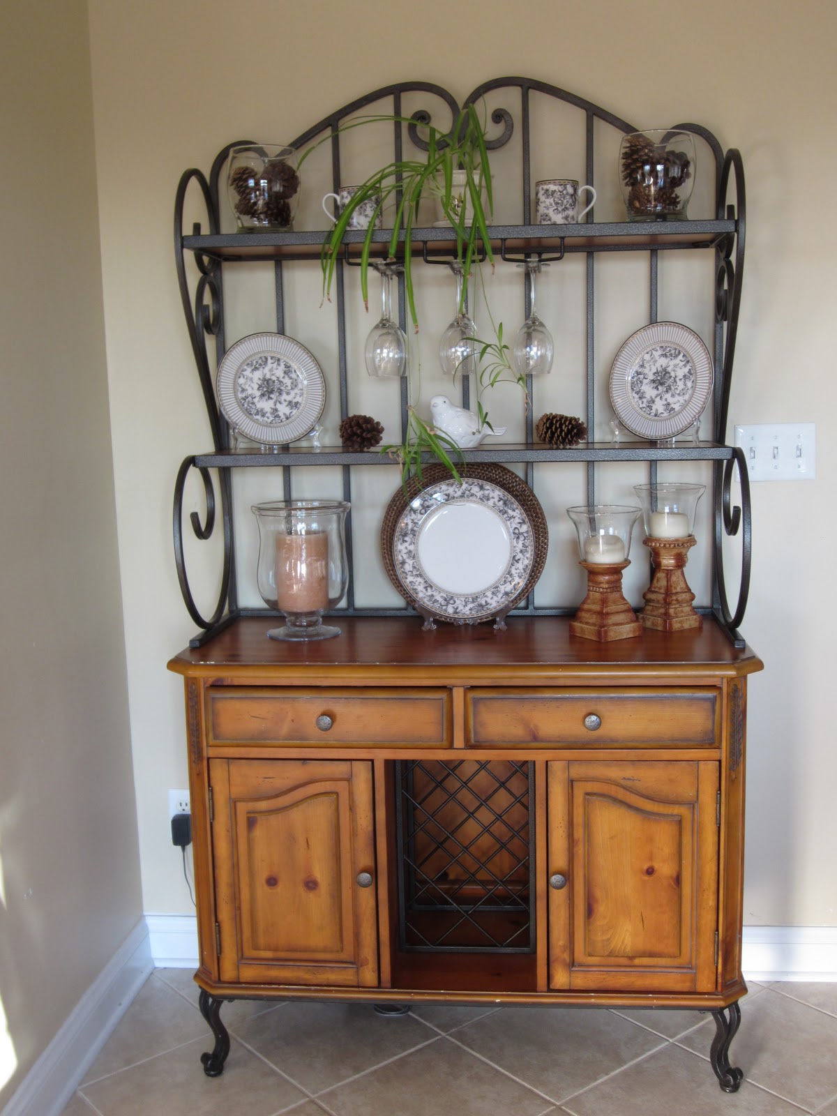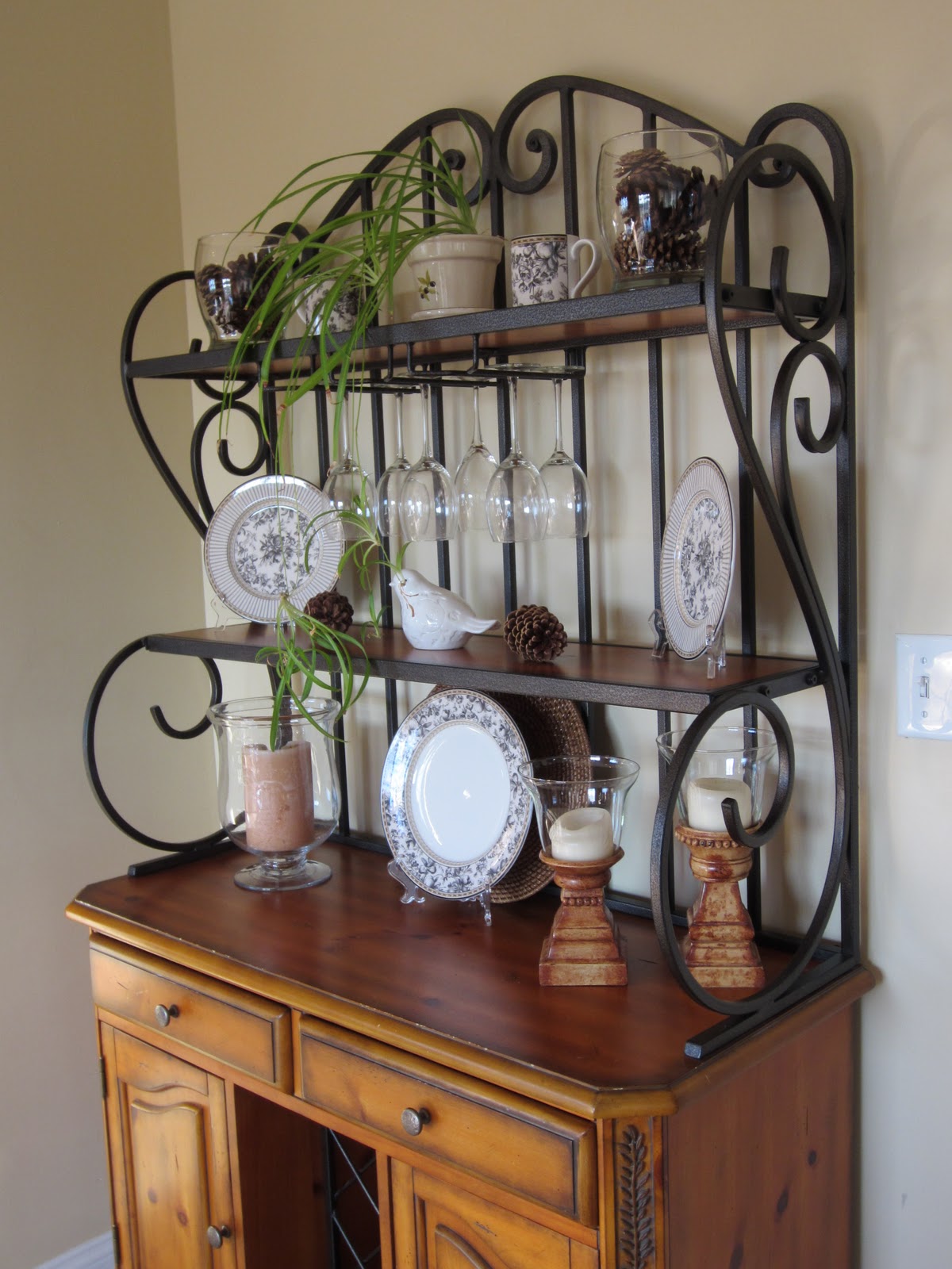 Oh, how pretty! Your bakers rack looks gorgeous! Love the pinecones!